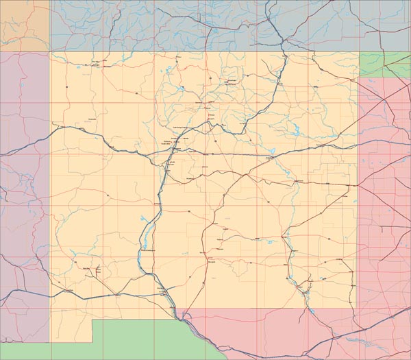 ![]() Detail view of EPS Vector Map of New Mexico - the land fill color is switched on. The EPS Vector map for New Mexico has 27 layers which may be individually modified or removed. Select the Vector only EPS map of New Mexico option to download this style map. |